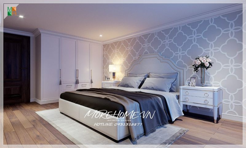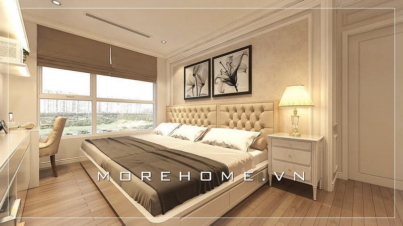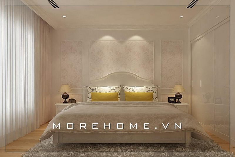 Nội thất phòng chung cư ngủ tân cổ điển thể hiện qua dáng giường, mẫu chăn ga, gối đệm, rèm buông đều mang phong cách cầu kỳ và chi tiết tỉ mỉ. Họa tiết trang trí chiếc giường được tối giản hóa nhưng vẫn hết sức lộng lẫy,ăn khớp với nội thất khác trong căn phòng ngủ mang lại 1 tổng thể hài hòa, thống nhất.