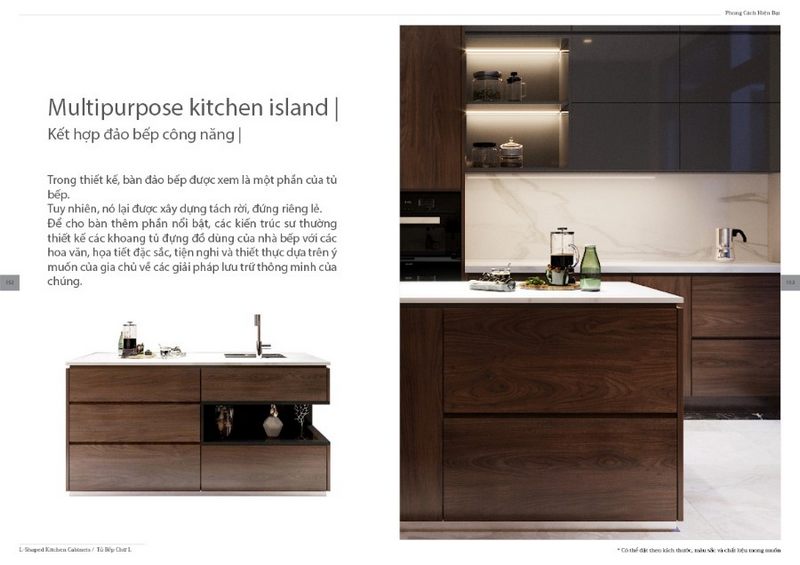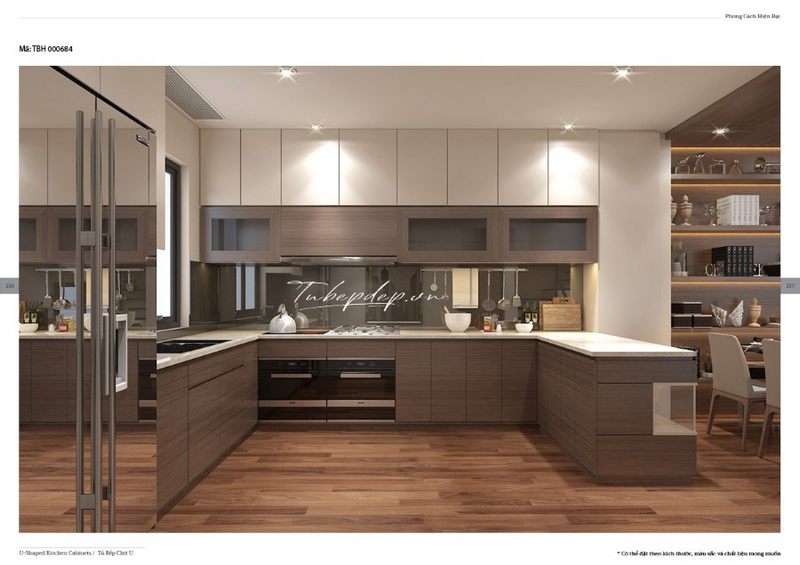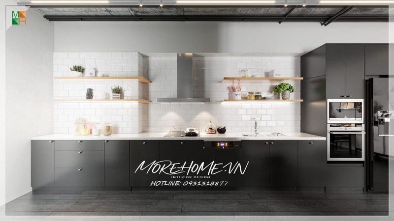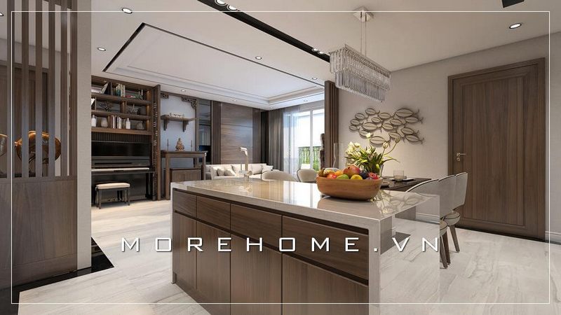 Chiêm ngưỡng mẫu thiết kế phòng bếp sang trọng mang phong cách hiện đại có hệ thống tủ bếp 2 tầng màu trắng - nâu tiện lợi để thấy những tính toán tỉ mỉ của các kiến trúc sư Morehome