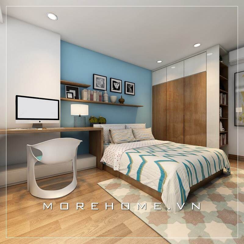 Bố trí nội thất phòng ngủ nhỏ đơn giản, phần vách tường đầu giường được dán giấy dán tường màu xanh lạ mắt tạo điểm nhấn ấn tượng cho không gian không quá đơn điệu