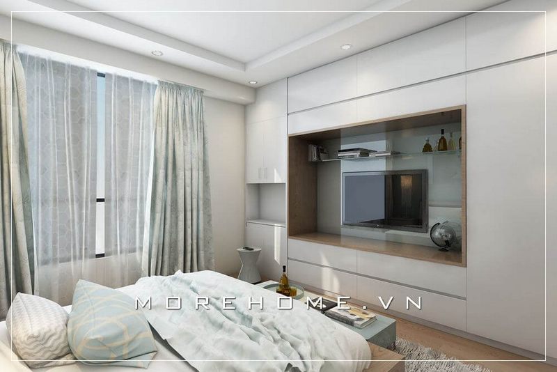 Tủ quần áo gỗ hiện đại được thiết kế theo phong cách kịch trần, kết hợp với kệ ti vi đa năng giúp tối ưu hóa sự tiện lợi cho người sử dụng.