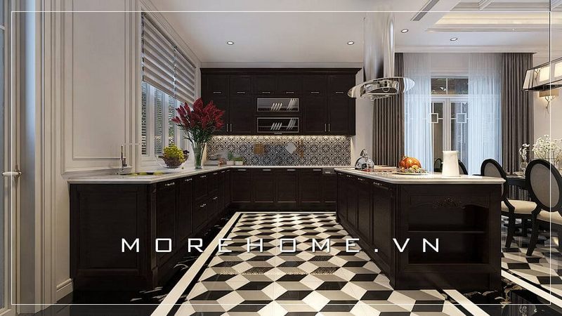 Mẫu tủ bếp cao cấp được làm từ gỗ tự nhiên, có thiết kế dạng chữ L giúp tạo nên không gian bếp sang trọng và tiện nghi.