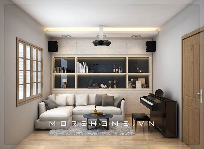 . Mẫu kệ sách hiện đại, kết hợp với kệ trang trí gỗ công nghiệp, được thiết kế âm tường giúp tạo nên không gian rộng rãi, đang được nhiều gia chủ yêu thích và sử dụng.